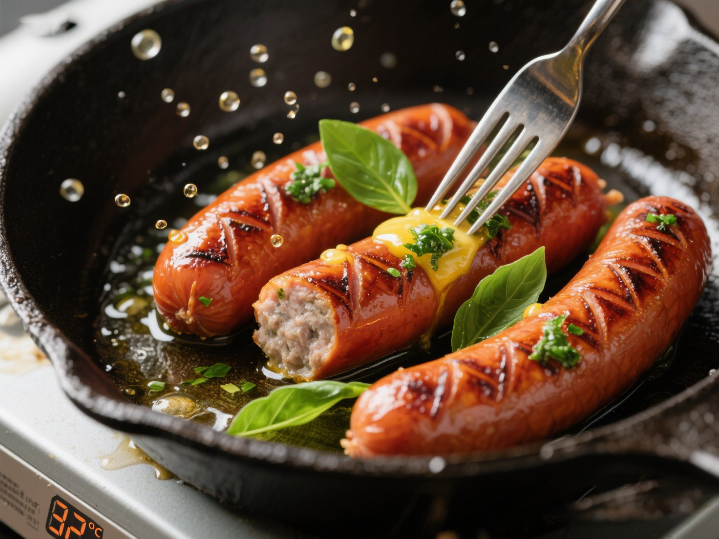 ③ 醬汁融合:倒出多余油 → 關(guān)火!加黃油+檸檬汁 → 余溫融化后撒羅勒碎,香腸滾蘸醬汁裝盤