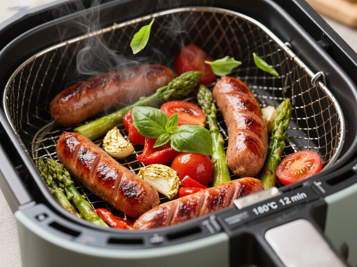 ① 分層投料:炸籃鋪錫紙 → 放蘆筍+番茄+蒜片 → 噴油,香腸段置蔬菜上(避免接觸炸籃)