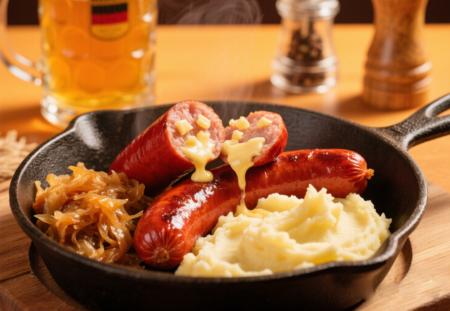 特點(diǎn):通過煎制形成酥脆腸衣,內(nèi)部奶酪熔化成流心狀態(tài),搭配德式酸菜解膩,還原地道巴伐利亞風(fēng)味。