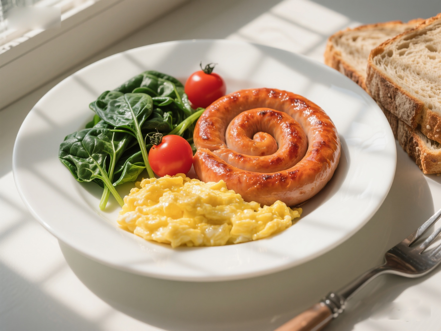 腸衣煎至酥脆,搭配烤蔬菜的甜潤,口感層次豐富。